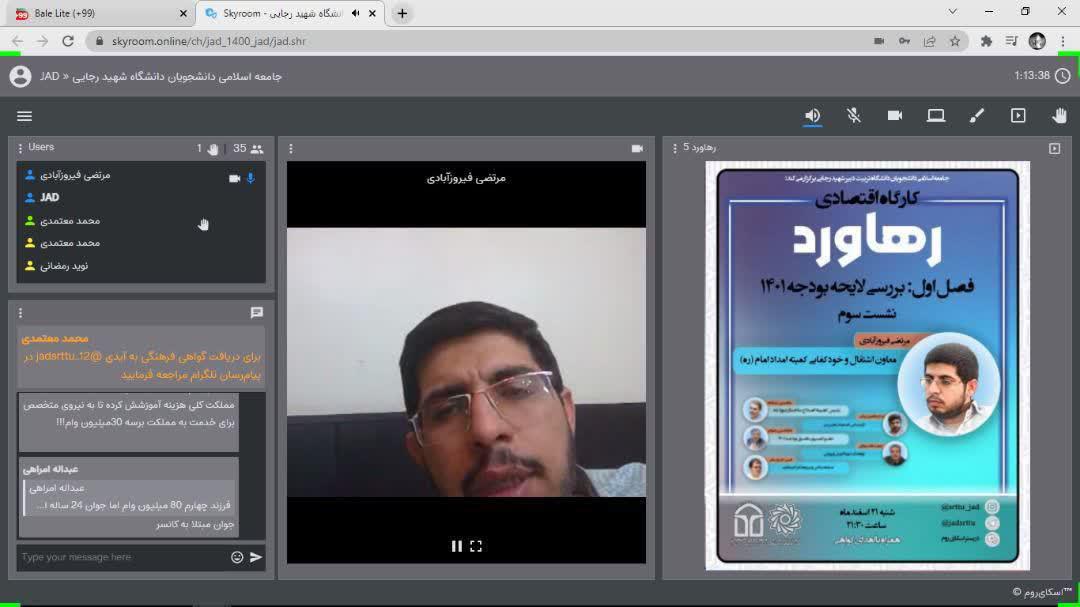 به گزارش کارشناس مسئول معاونت فرهنگی دانشگاه به همت جامعه اسلامی دانشجویان دانشگاه تربیت دبیر شهید رجایی سومین نشست از کارگاه اقتصادی “رهاورد” با موضوع بررسی لایحه بودجه ۱۴۰۱با حضور دکتر مرتضی فیروزآبادی(معاون اشتغال و خودکفایی کمیته امداد) با حضور حدودا ۴۰ نفر از مخاطبین به مدت ۱ ساعت از ساعت ۲۱:۳۰ روز شنبه ۲۱ اسفند در بستر فضای مجازی بصورت وبینار برگزار شد.