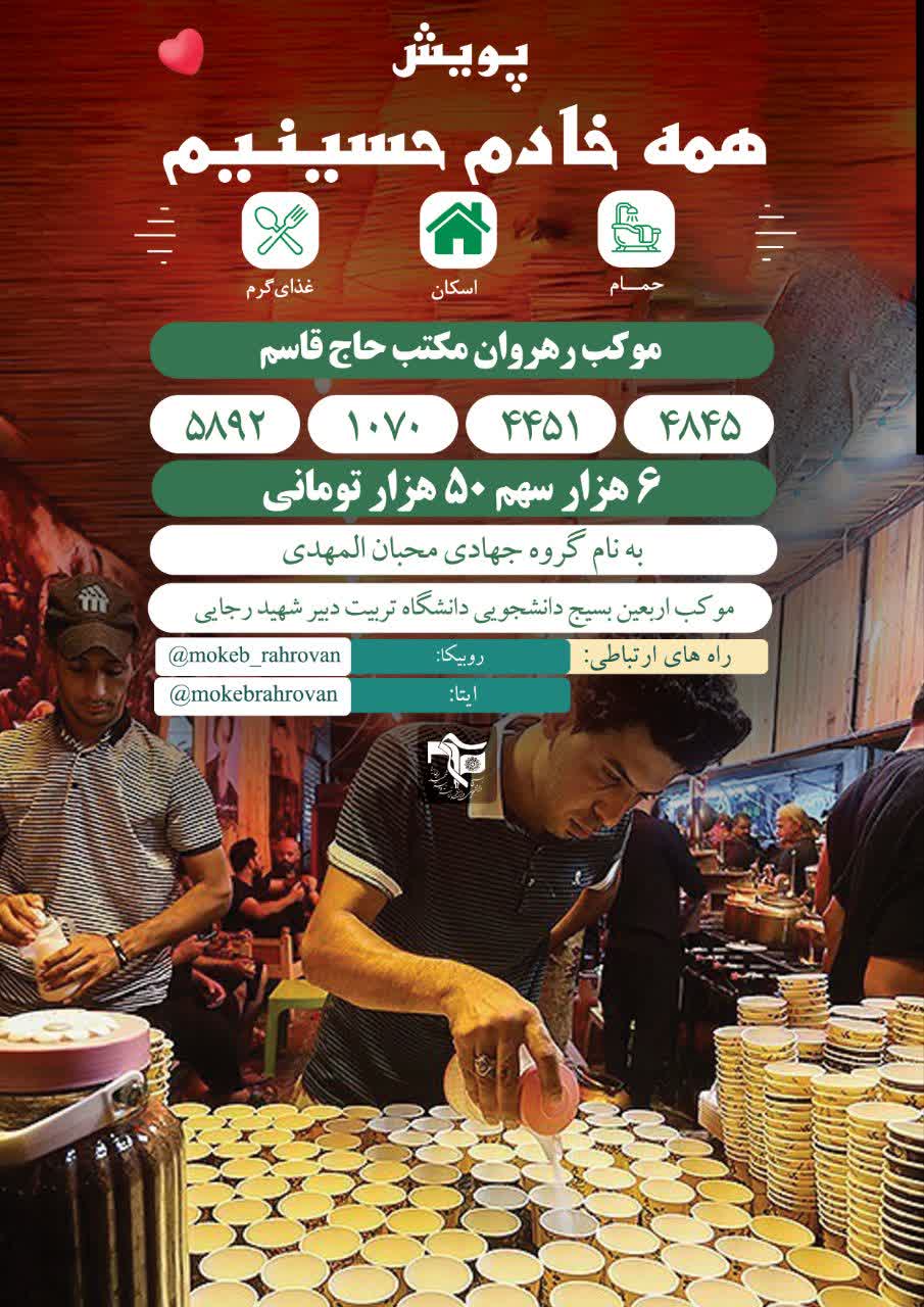 کمک به راه اندازی موکب رهروان مکتب حاج قاسم، جهت اسکان و پذیرایی از زائرین اربعین حسینی در کربلای معلی ۶۰۰۰ سهم ۵۰ هزارتومانی