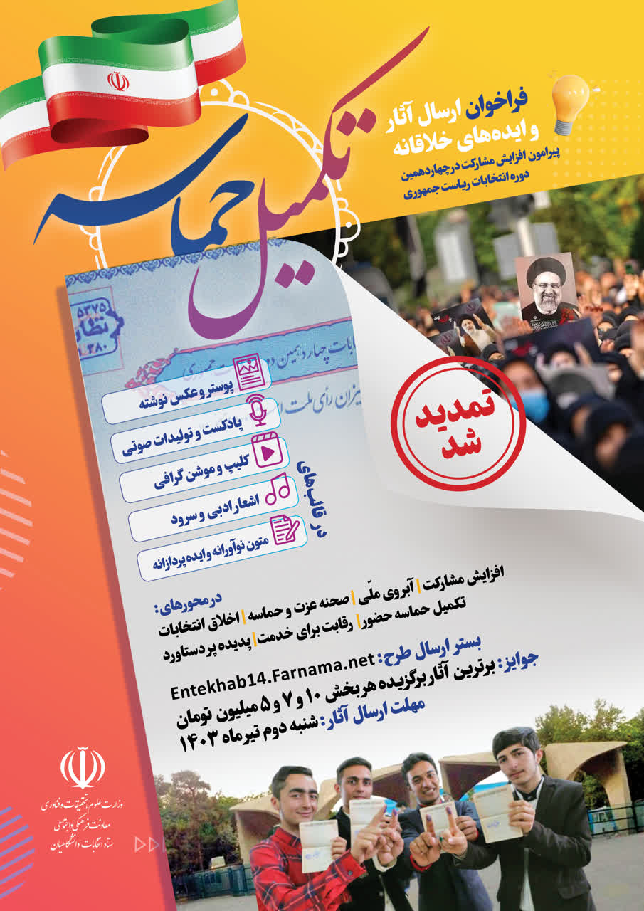 فراخوان ارسال آثار پیرامون افزایش مشارکت در ۱۴مین انتخابات ریاست جمهوری تحت عنوان «تکمیــــل حماســــه» تمدید شد.