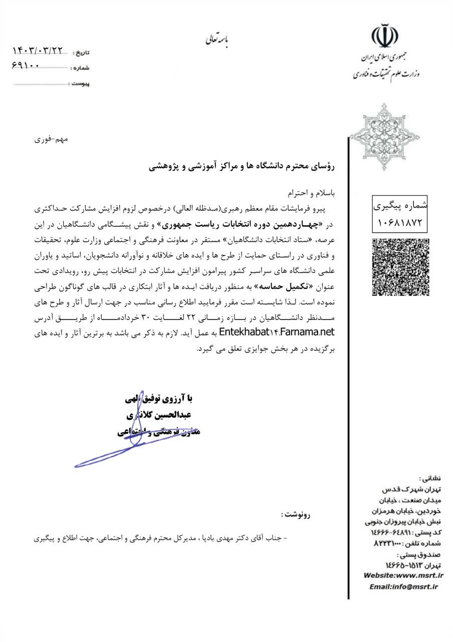 - مهلت ارسال : ۳۰ خرداد ۱۴۰۳