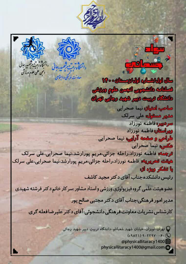📣 معاونت فرهنگی و اجتماعی خبر داد : به همت انجمن علمی علوم ورزشی دانشگاه تربیت دبیر شهید رجایی، انتشار می یابد: 🔵 فصل نامه دانشجویی انجمن علمی علوم ورزشی موضوع :پرداختن به موضوعات علمی مرتبط با چاپ مقالات به روز و مصاحبه با نخبگان علمی ⏰ زمان شروع انتشار : از زمستان ۱۴۰۰