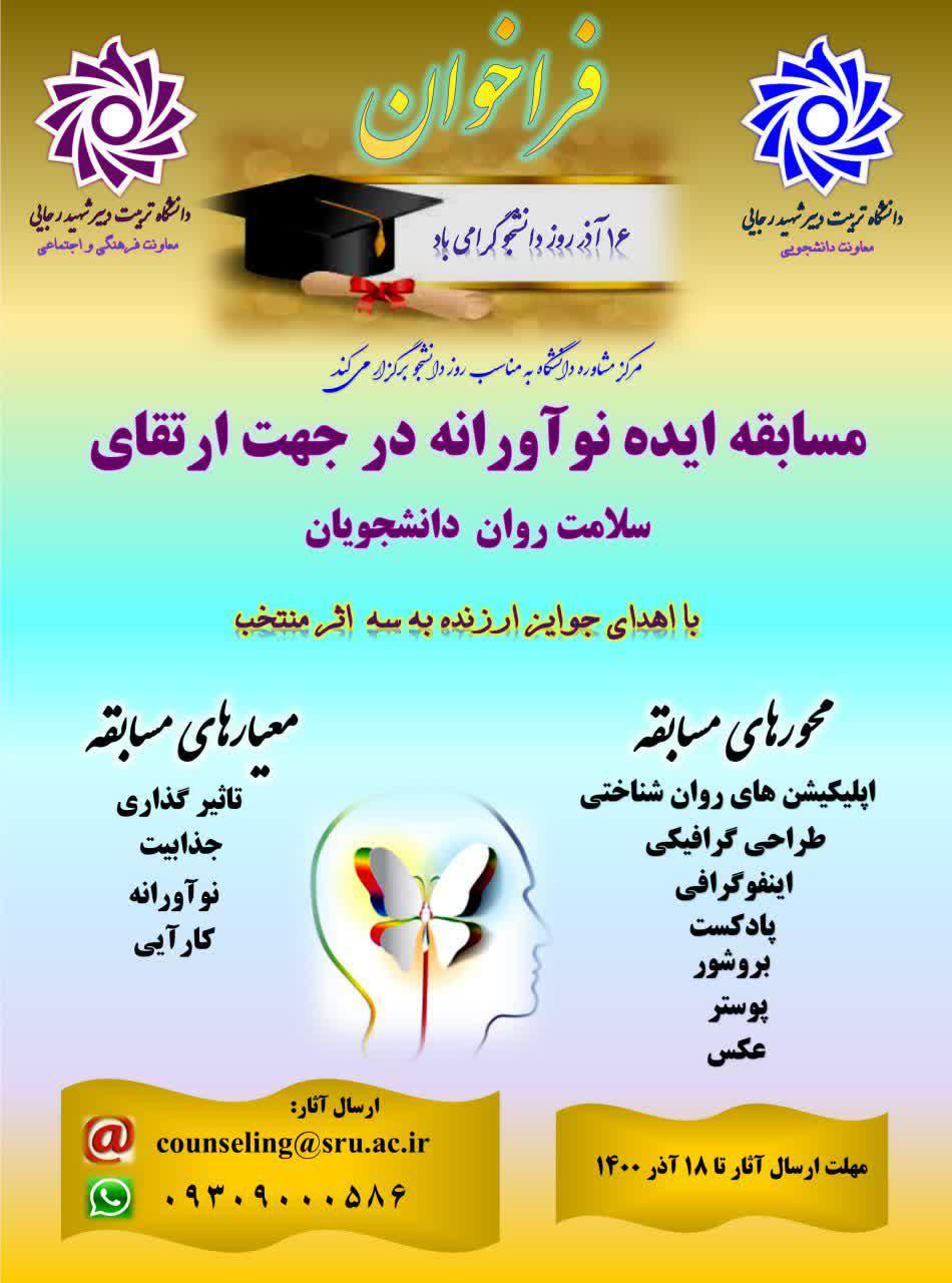 مسابقه ایده نوآورانه درجهت ارتقای سلامت روان دانشجویان. ۱۳ آذر ۱۴۰۰/در Uncategorised, اخبار معاونت فرهنگی و اجتماعی /توسط cultureمعاونت فرهنگی واجتماعی خبرداد ؛ مسابقه ایده نوآورانه درجهت ارتقای سلامت روان دانشجویان باهمکاری مرکز مشاوره معاونت دانشجویی دانشگاه با اعطای جوایز نفیس به سه اثر منتخب درمحورهای متنوع مهلت ارسال آثار تا ۱۸ آذر ماه ارسال به شماره واتساپ ۰۹۳۰۹۰۰۰۵۸۶ ویا به ایمیل ؛canseling@sru.ac.ir https://www.sru.ac.ir/wp-content/uploads/2021/12/ایده-نو.jpg 553 941 culture https://www.sru.ac.ir/wp-content/uploads/2020/06/arm-uni-97-white-300x300.png culture2021-12-05 00:42:112021-12-05 00:42:11مسابقه ایده نوآورانه درجهت ارتقای سلامت روان دانشجویان.