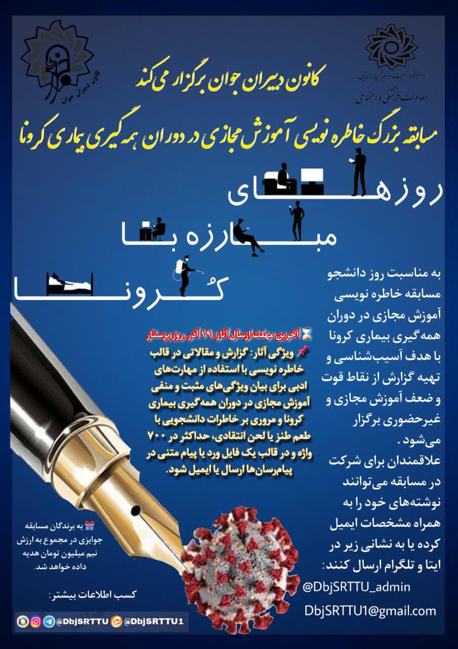 💠 به مناسبت روز دانشجو ، مسابقه #خاطره_نویسی آموزش مجازی در دوران همهگیری بیماری #کرونا با هدف آسیبشناسی و تهیه گزارش از نقاط قوت و ضعف آموزش مجازی و غیرحضوری برگزار میشود.