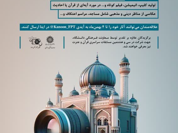 علاقمندان میتوانند برای کسب اطلاعات کامل مسابقه و ارسال آثار خود تا ۴ بهمن ماه با آیدی @Kanoon_fpt در ارتباط باشند.