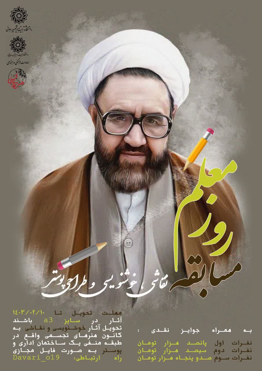 مسابقه روز معلم با جوایز نفیس ۴ اردیبهشت ۱۴۰۳/در اخبار معاونت فرهنگی و اجتماعی /توسط culture معاونت فرهنگی و اجتماعی خبر داد: مسابقه روز معلم با جوایز نفیس در زمینه های: نقاشی خوشنویسی طراحی پوستر مهلت ارسال تا تاریخ: ۱۴۰۳/۰۲/۱۰ موضوع: مرتبط به معلم سایز آثار A3 آثار نقاشی و خوشنویسی به کانون هنرهای تجسمی تحویل داده شود(طبقه منفی یک ساختمان اداری) پوستر ها به صورت فایل ارسال شوند. جوایز: نفرات اول هر زمینه ۵۰۰ هزار تومان نفرات دوم هر زمینه ۳۰۰ هزار تومان نفرات سوم هر زمینه ۱۵۰ هزار تومان راه ارتباطی ما: @Davari_o19 https://www.sru.ac.ir/wp-content/uploads/2024/04/photo10969067086.jpg 1280 905 culture https://www.sru.ac.ir/wp-content/uploads/2020/06/arm-uni-97-white-300x300.png culture2024-04-23 15:08:502024-04-23 15:08:50مسابقه روز معلم با جوایز نفیس