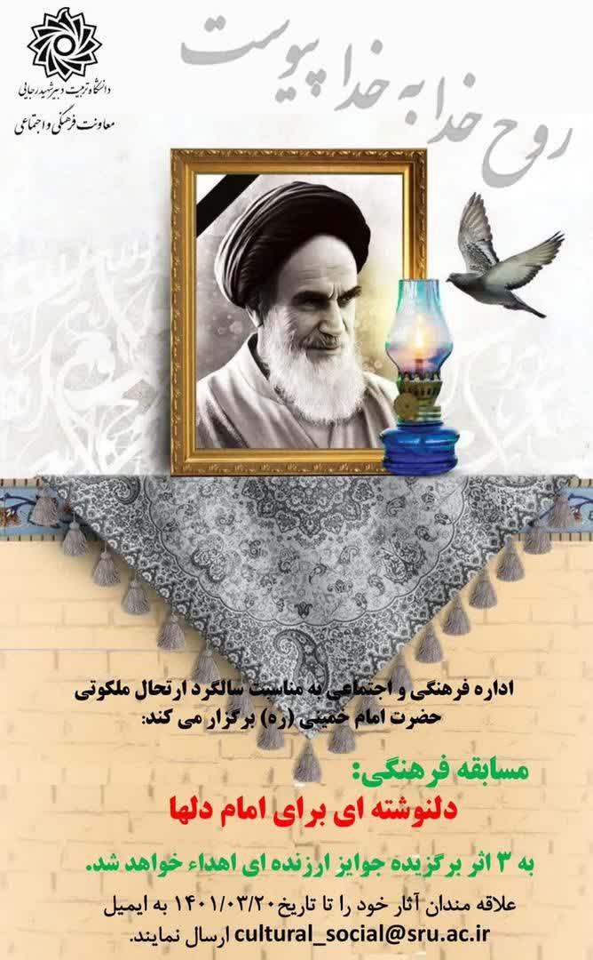 معاونت فرهنگی و اجتماعی دانشگاه ضمن عرض تسلیت به مناسبت سالگرد ارتحال بنیانگذار کبیر جمهوری اسلامی ایران، حضرت امام خمینی (ره)، برگزار می کند؛