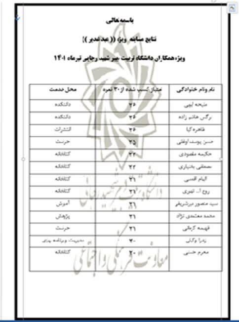 اسامی و نتایج امتیاز مکتسبه همکاران شرکت کننده دانشگاه درمسابقه کتابخوانی ویژه غدیر اعلام می گردد. لازم بذکر است اسامی نهایی برندگان مسابقه بعد از قرعه کشی اعلام خواهد شد.
