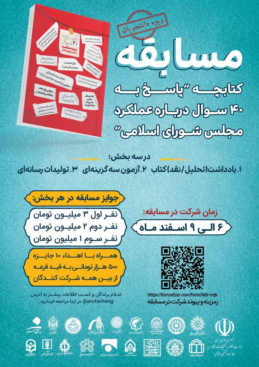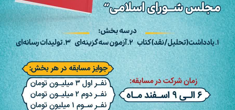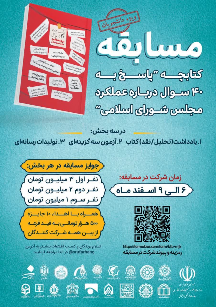 مسابقه کتابچه ۷ اسفند ۱۴۰۲/در اخبار معاونت فرهنگی و اجتماعی /توسط culture معاونت فرهنگی و اجتماعی خبر داد: مسابقه کتابچه “پاسخ به ۴۰ سوال درباره عملکرد مجلس شورای اسلامی” ویژه دانشجویان سراسر کشور در سه بخش: ۱. یادداشت(تحلیل و نقد کتاب) ۲. آزمون سه گزینهای ۳. تولیدات رسانهای جوایز مسابقه در هر بخش: نفر اول ۳ میلیون تومان نفر دوم ۲ میلیون تومان نفر سوم ۱ میلیون تومان همراه با اهداء ۱۰ جایزه ۵۰۰ هزار تومانی به قید قرعه از بین همه شرکت کنندگان زمان شرکت در مسابقه ۶ تا ۹ اسفند دانلود کتاب و پیوند شرکت در مسابقه https://formafzar.com/form/ktb-mjls معاونت فرهنگی و اجتماعی دانشگاههای استان تهران، معاونت فرهنگی و اجتماعی وزارت علوم معاونت فرهنگی و اجتماعی دانشگاه تربیت دبیر شهید رجایی @srufarhang https://www.sru.ac.ir/wp-content/uploads/2024/02/photo9953545308.jpg 1280 904 culture https://www.sru.ac.ir/wp-content/uploads/2020/06/arm-uni-97-white-300x300.png culture2024-02-26 10:31:102024-02-26 12:09:01مسابقه کتابچه