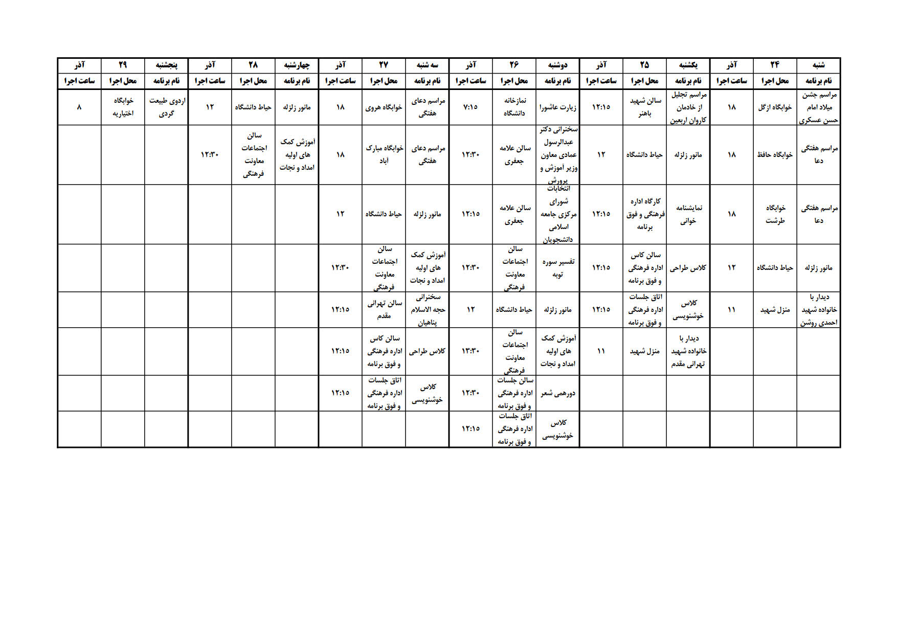 برنامه های هفته آخر آذر ماه معاونت فرهنگی و اجتماعی اعلام گردید. آقای دکتر احمدی اعلام نمود که علی رغم شروع فصل امتحانات پایانی نیم سال، واحدهای مختلف معاونت فرهنگی و اجتماعی و دانشجویان برنامه های متنوعی دارند. او برنامه ها را به شرح زیر اعلام نمود: