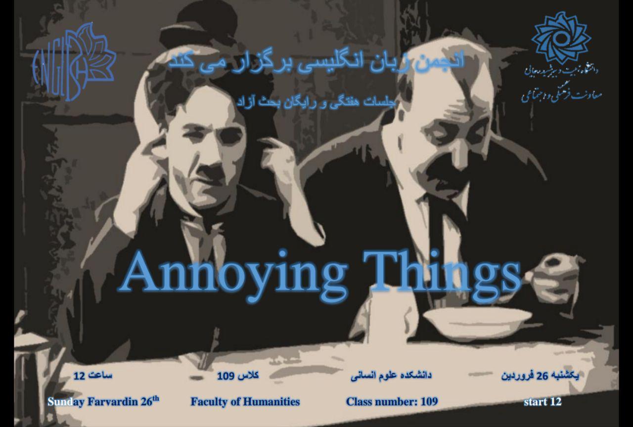 دوره جدید جلسات بحث آزاد به زبان انگلیسی از روز دوشنبه مورخ ۲۶ فروردین ماه آغاز گردید. علیزاده دبیر انجمن علمی زبان انگلیسی موضوع این جلسه را Annoying Things و محل آن را کلاس ۱۰۹ دانشکده علوم انسانی اعلام نمود.