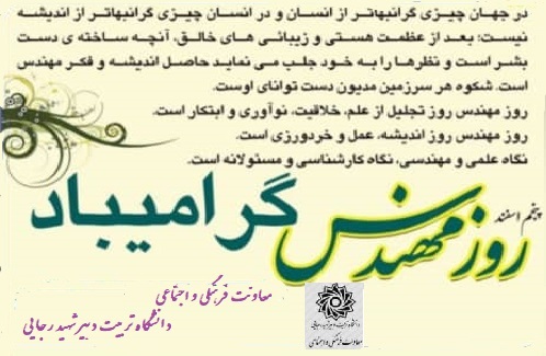 روز مهندس را به تمام مهندسان ساعی و تلاشگر کشور عزیزمان بویژه اساتید و دانشجویان دانشگاه تربیت دبیر شهید رجایی و مهندسان عزیز فرهنگی تبریک عرض می کند و توفیق روز افزون همه ایرانیان را از خداوند متعال خواهانیم