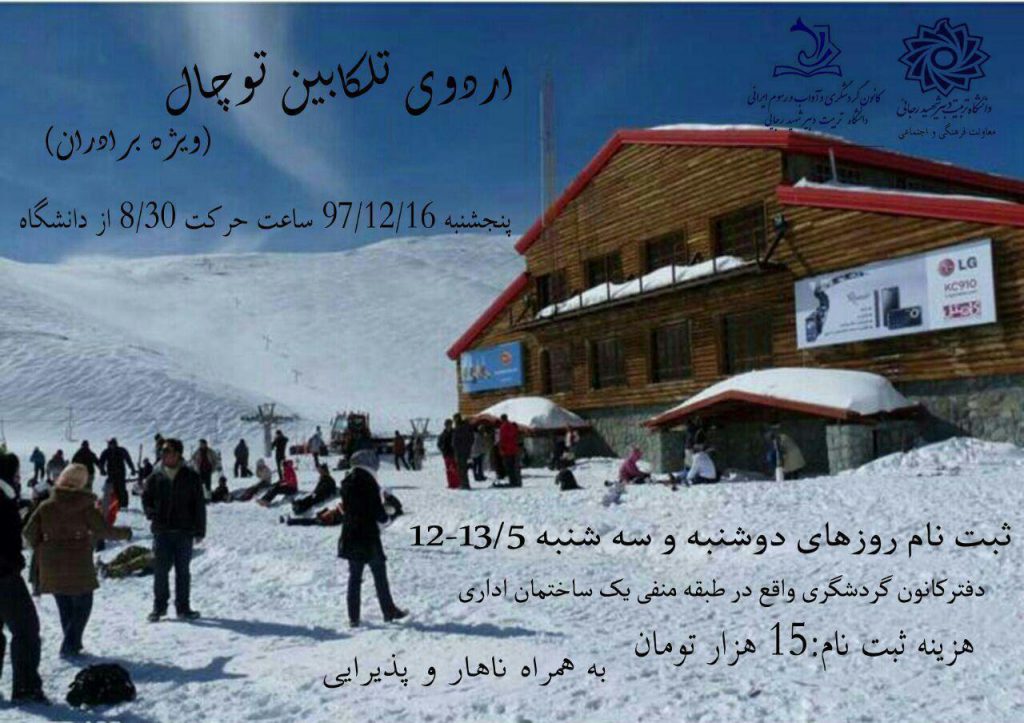 به همت کانون گردشگری و آداب و رسوم ایرانی،اردوی تفریحی تله کابین توچال ویژهی برادران در روز پنجشنبه مورخ ۱۶ ام اسفندماه برگزار میگردد.