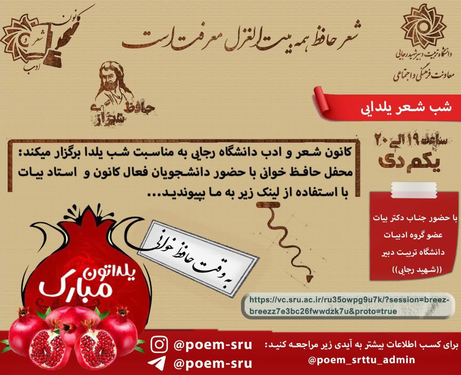 معاونت فرهنگی و اجتماعی دانشگاه تربیت دبیر شهید رجایی تهران خبر داد: 🍉شب شعر یلدایی🍉