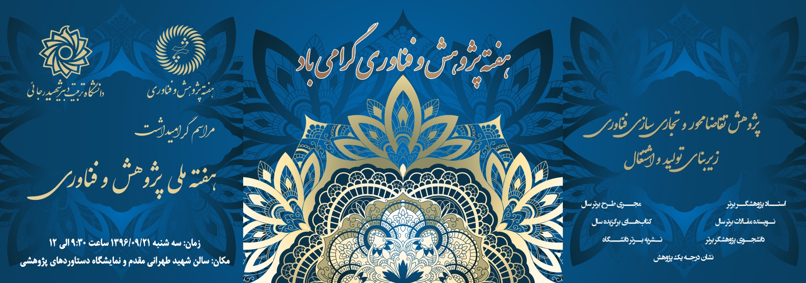 آیین تجلیل از منتخبان حوزه پژوهش و فناوری دانشگاه: سه شنبه ۲۱ آذرماه ساعت ۹:۳۰ تا ۱۲ سالن شهید طهرانی مقدم