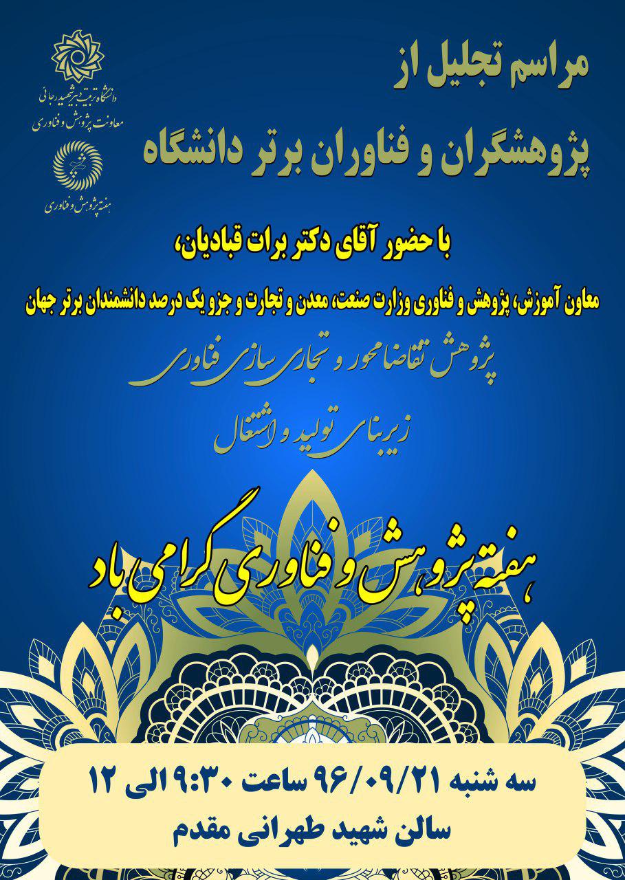 مراسم تجلیل از برگزیدگان و منتخبان حوزه پژوهش و فناوری دانشگاه؛ سه شنبه ۲۱ آذر، ساعت ۹:۳۰ تا ۱۲، سالن شهید طهرانی مقدم
