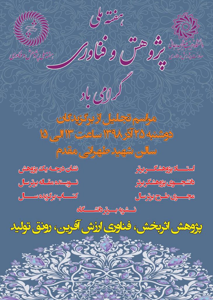 با عنایت به تعطیلی فعالیت های آموزشی دانشگاه های تهران در روزهای دوشنبه و سه شنبه ۲۵ و ۲۶ آذرماه، دکتر محمد شمس اسفندآبادی معاون پژوهش وفناوری از برگزاری مراسم روز ملی پژوهش و فناوری در روز ۲ دی ۱۳۹۸ خبر داد. وی افزود در این مراسم که از ساعت ۱۳ الی ۱۵ در سالن شهید طهرانی مقدم برگزار می شود، از اساتید و دانشجویان پژوهشگر برتر سال ۹۸ تقدیر خواهد شد.