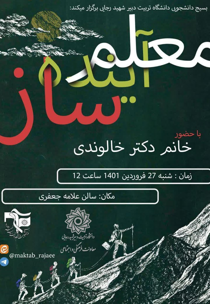 به گزارش کارشناس مسئول معاونت فرهنگی واجتماعی دانشگاه به همت بسیج دانشجویی مراسمی با موضوع معلم آینده ساز در روز شنبه ۲۷ فروردین ماه ۱۴۰۱ از ساعت ۱۲ لغایت ۱۳درسالن علامه جعفری دانشگاه با حضور حدود ۴۰ نفر از دانشجویان و با سخنرانی خانم دکترخالوندی برگزار گردید .