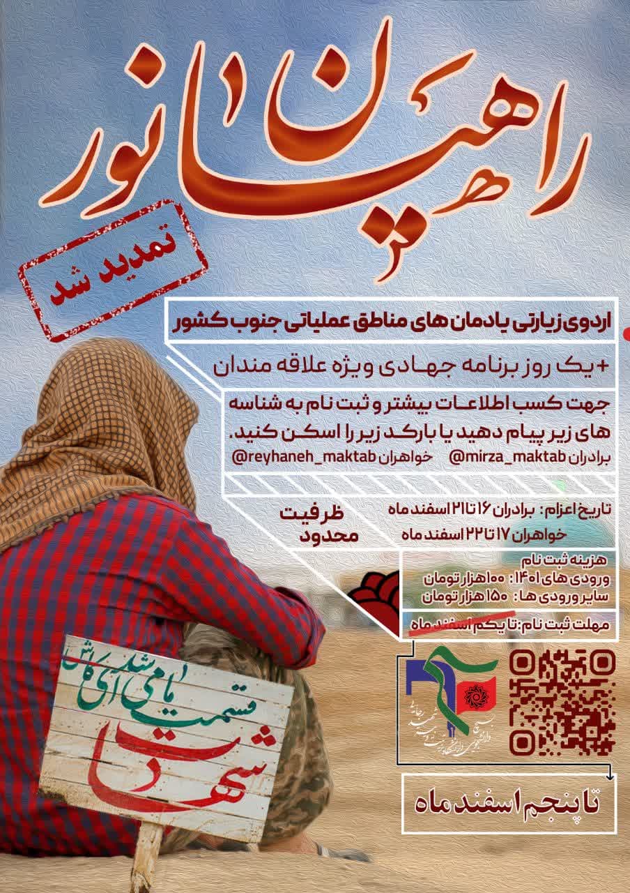 🔻 به اطلاع می رساند مهلت ثبت نام اردوی راهیان نور ، تا پنج اسفند ماه تمدید شد