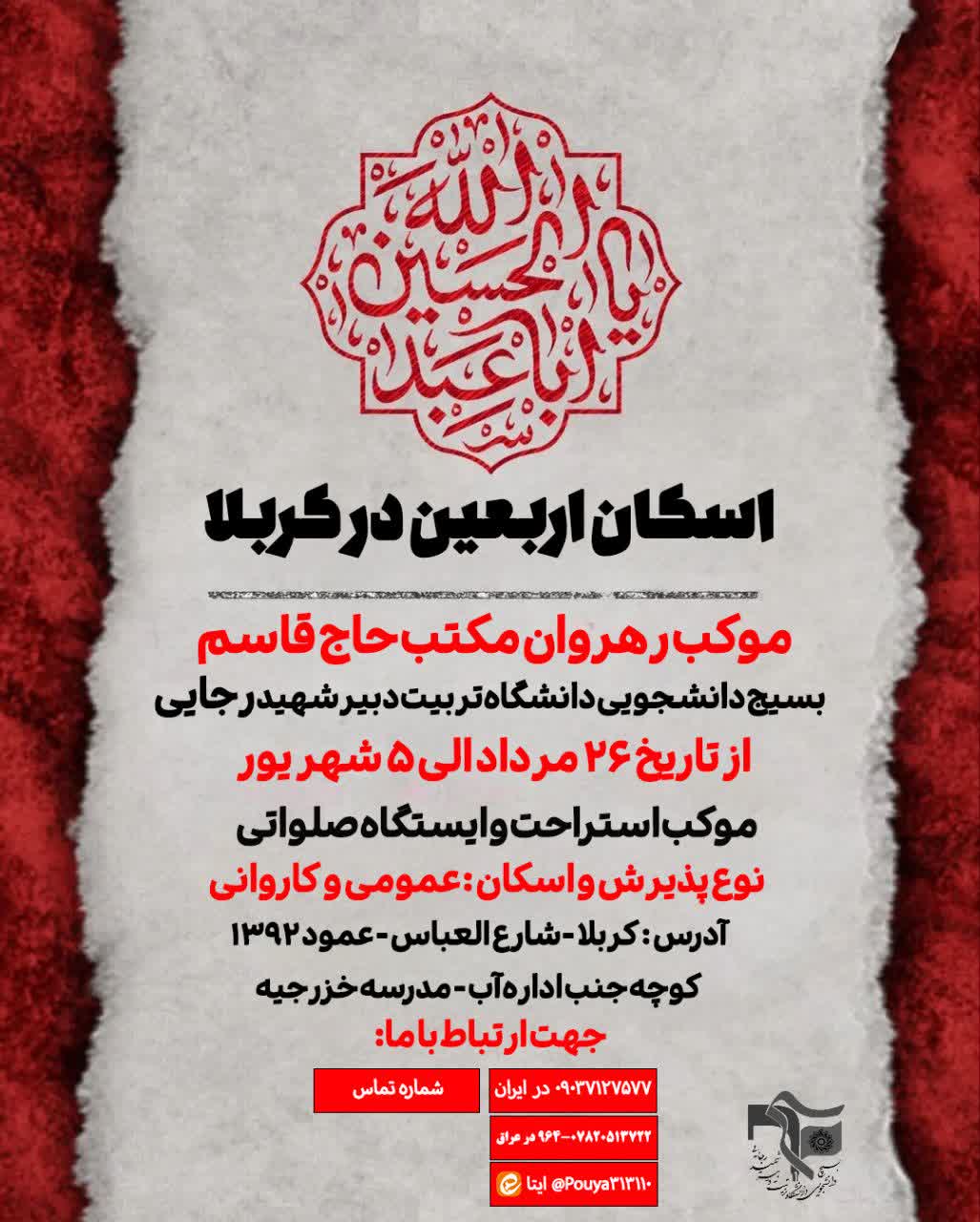 با عنایت حضرت سیدالشهدا (ع) و کمکهای شما عزیزان، موکب رهروان مکتب حاج قاسم بسیج دانشجویی دانشگاه تربیت دبیر شهید رجایی جهت استراحت و اسکان و ایستگاه صلواتی آماده خدمت رسانی به زائرین اربعین میباشد.