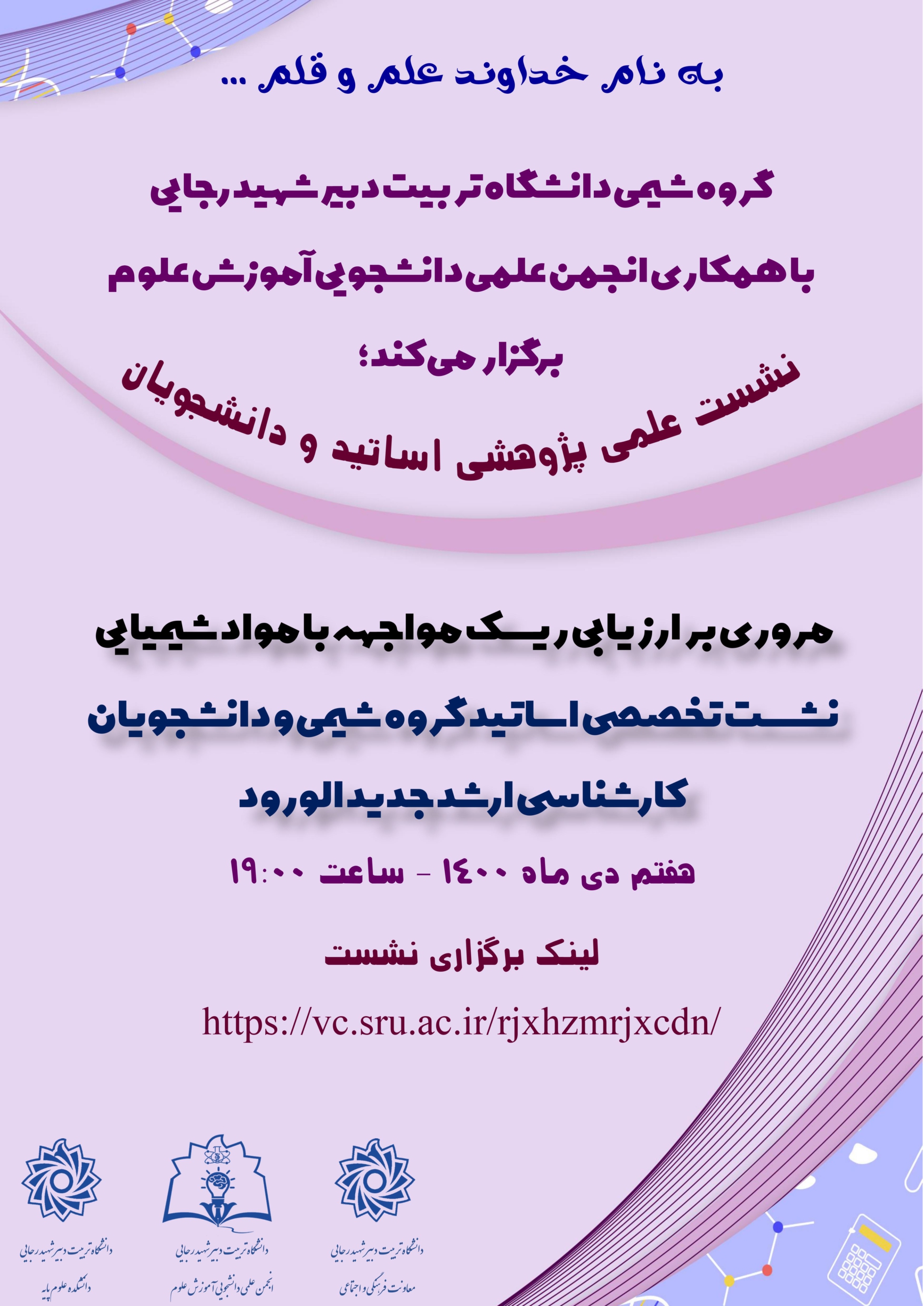 به گزارش کارشناس انجمن های علمی معاونت فرهنگی و اجتماعی دانشگاه تربیت دبیر شهید رجایی، درتاریخ سهشنبه ، ۷ دیماه ۱۴۰۰، نشست تخصصی اساتید گروه شیمی و دانشجویان کارشناسی ارشد جدید الورود و نشست علمی پژوهشی اساتید و دانشجویان، از طرف گروه شیمی دانشگاه، با همکاری انجمن علمی دانشجویی آموزش علوم و با سخنرانی آقای بهنام حسین پور، دانشجوی ورودی ۹۷ کارشناسی شیمی محض و با عنوان “مروری بر ارزیابی ریسک مواجهه با مواد شیمیایی ” برگزار می گردد.