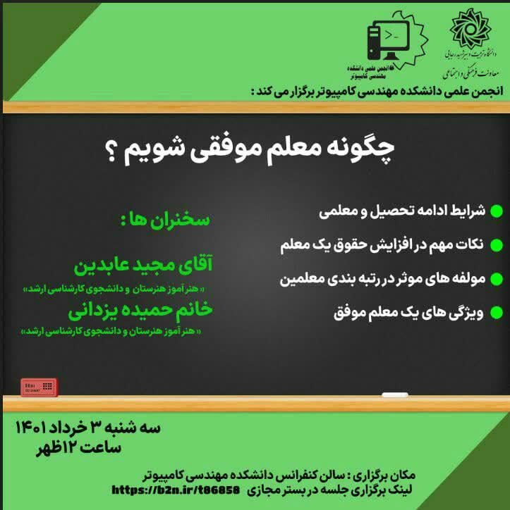 وبینار ، چگونه معلم موفقی شویم؟ ۲۹ خرداد ۱۴۰۱/در اخبار معاونت فرهنگی و اجتماعی /توسط culture📣 معاونت فرهنگی و اجتماعی دانشگاه خبر داد؛ به همت انجمن علمی کامپیوتر و با همکاری دانشکده کامپیوتر دانشگاه تربیت دبیر شهید رجایی برگزار گردید : 🔴 وبینار ، چگونه معلم موفقی شویم؟ سخنران ها : دانشجویان کارشناسی ارشد :آقای مجید عابدین _ خانم حمیده یزدانی ⏰ زمان: سه شنبه ۳/ ۳/ ۱۴۰۱ ساعت ۱۲ https://www.sru.ac.ir/wp-content/uploads/2022/06/photo_۲۰۲۲-۰۶-۱۸_۱۳-۴۱-۵۳.jpg 724 723 culture https://www.sru.ac.ir/wp-content/uploads/2020/06/arm-uni-97-white-300x300.png culture2022-06-19 15:28:212022-06-19 15:28:21وبینار ، چگونه معلم موفقی شویم؟