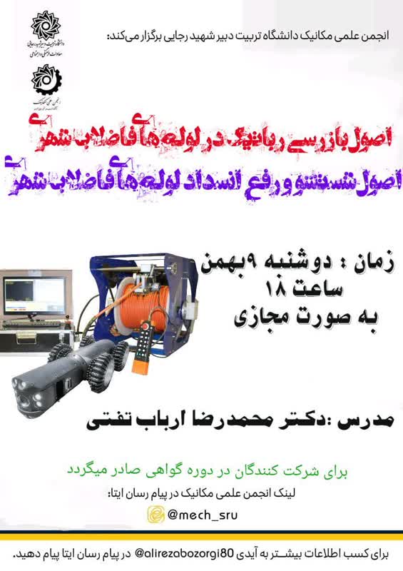 وبینار مجازی، اصول بازرسی رباتیک در لوله های فاضلاب شهری ۴ بهمن ۱۴۰۲/در اخبار معاونت فرهنگی و اجتماعی /توسط cultureمعاونت فرهنگی و اجتماعی خبر داد : به همت انجمن علمی دانشجویی مکانیک دانشگاه تربيت دبیر شهید رجایی برگزار می گردد : وبینار مجازی، اصول بازرسی رباتیک در لوله های فاضلاب شهری استاد : دکتر محمد رضا ارباب تفتی زمان : دوشنبه ۹ بهمن ماه ، ساعت ۱۸ مکان کلاس : بستر سامانه Lms پیام رسان ایتا، @ mech_sru https://www.sru.ac.ir/wp-content/uploads/2024/01/a16527c2-6c30-4611-839c-46f1ac2a7a9f.jpg 800 565 culture https://www.sru.ac.ir/wp-content/uploads/2020/06/arm-uni-97-white-300x300.png culture2024-01-24 13:17:242024-01-24 16:12:21 وبینار مجازی، اصول بازرسی رباتیک در لوله های فاضلاب شهری