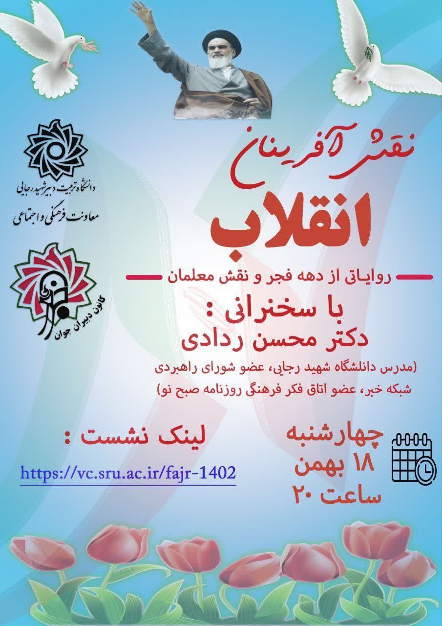 وبینار مجازی روایاتی از دهه فجر ۱۷ بهمن ۱۴۰۲/در اخبار معاونت فرهنگی و اجتماعی /توسط culture معاونت فرهنگی و اجتماعی خبر داد: کانون دبیران جوان به مناسبت دهه فجر برگزار میکند؛ وبینار مجازی روایاتی از دهه فجر با حضور استاد گرانقدر محسن ردادی به همراه اهدا گواهی به دانشجویان حاضر در وبینار لینک ورود به جلسه : https://vc.sru.ac.ir/fajr-1402 زمان:چهارشنبه ۱۸ بهمن ماه ساعت ۲۰:۰۰ @DbjSRTTU1 https://www.sru.ac.ir/wp-content/uploads/2024/02/photo9580648847-1.jpg 1280 905 culture https://www.sru.ac.ir/wp-content/uploads/2020/06/arm-uni-97-white-300x300.png culture2024-02-06 10:59:462024-02-06 10:59:54وبینار مجازی روایاتی از دهه فجر