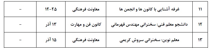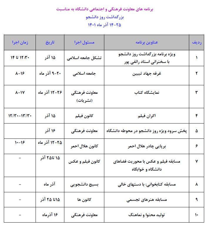 به مناسبت بزرگداشت روز دانشجو از ۱۴ لغایت ۲۵ آذر ماه به شرح جدول ذیل برگزار خواهد شد