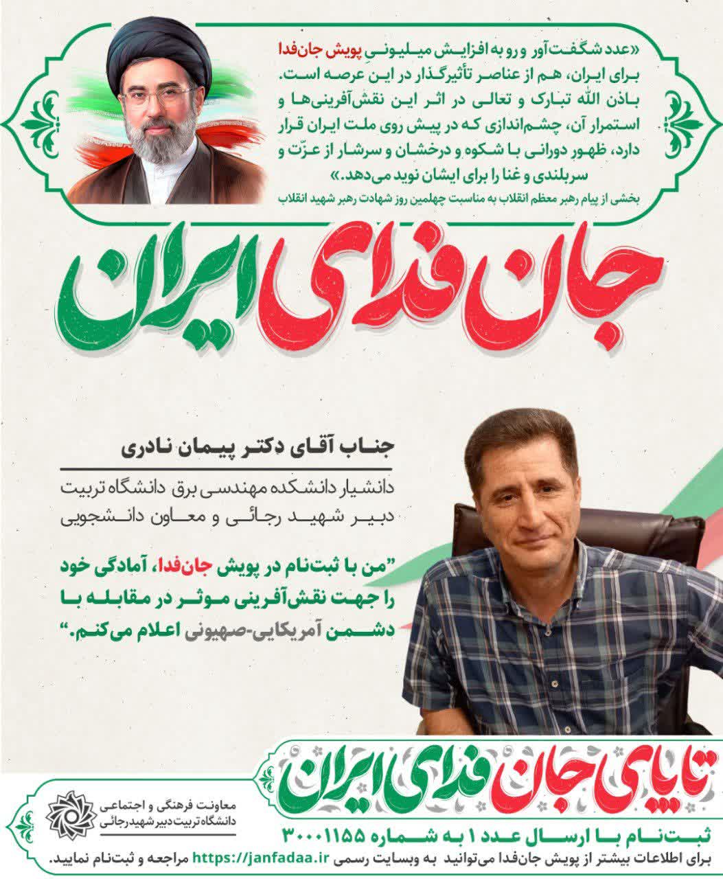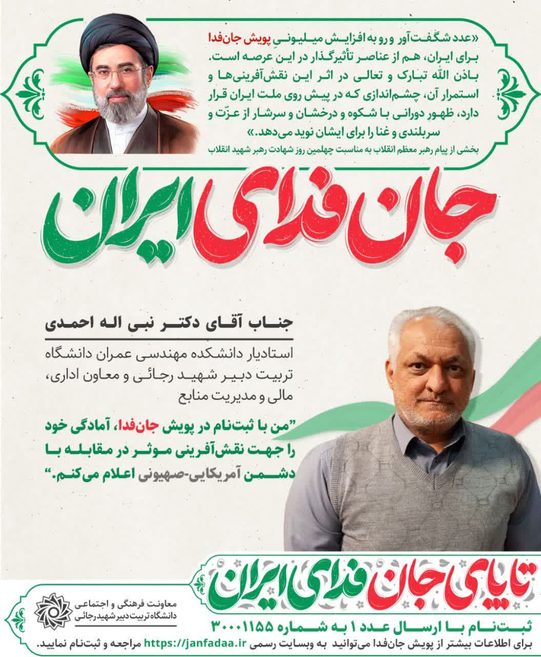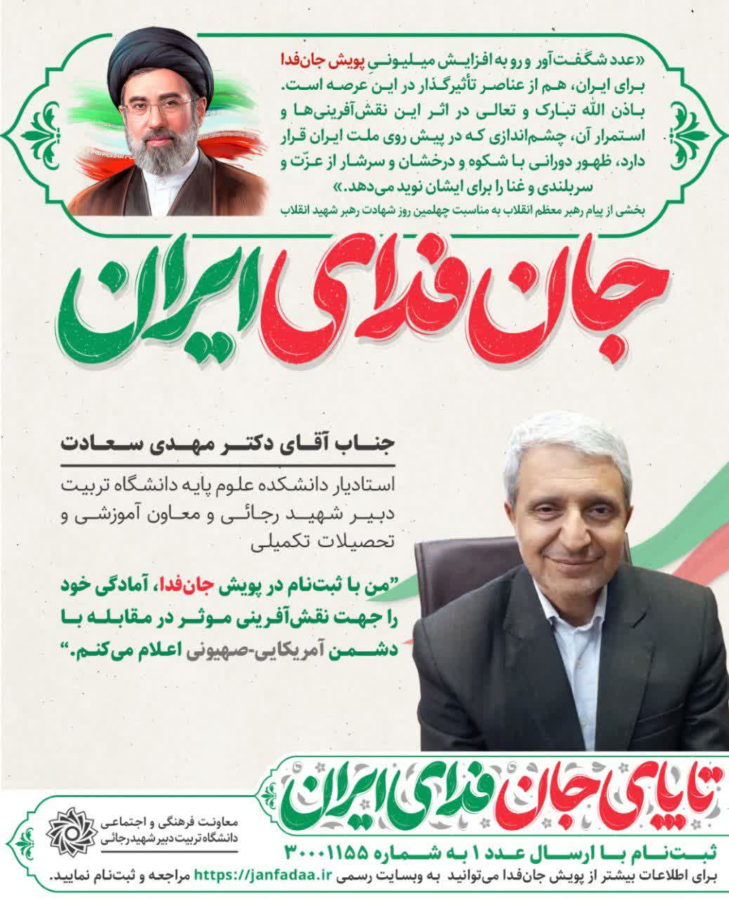 رئیس محترم دانشگاه تربیت دبیر شهید رجائی و معاونان ایشان در سامانه جان فدا ثبتنام کردند و آمادگی خود را جهت نقشآفرینی موثر در مقابله با دشمن آمریکایی-صهیونی اعلام کردند.