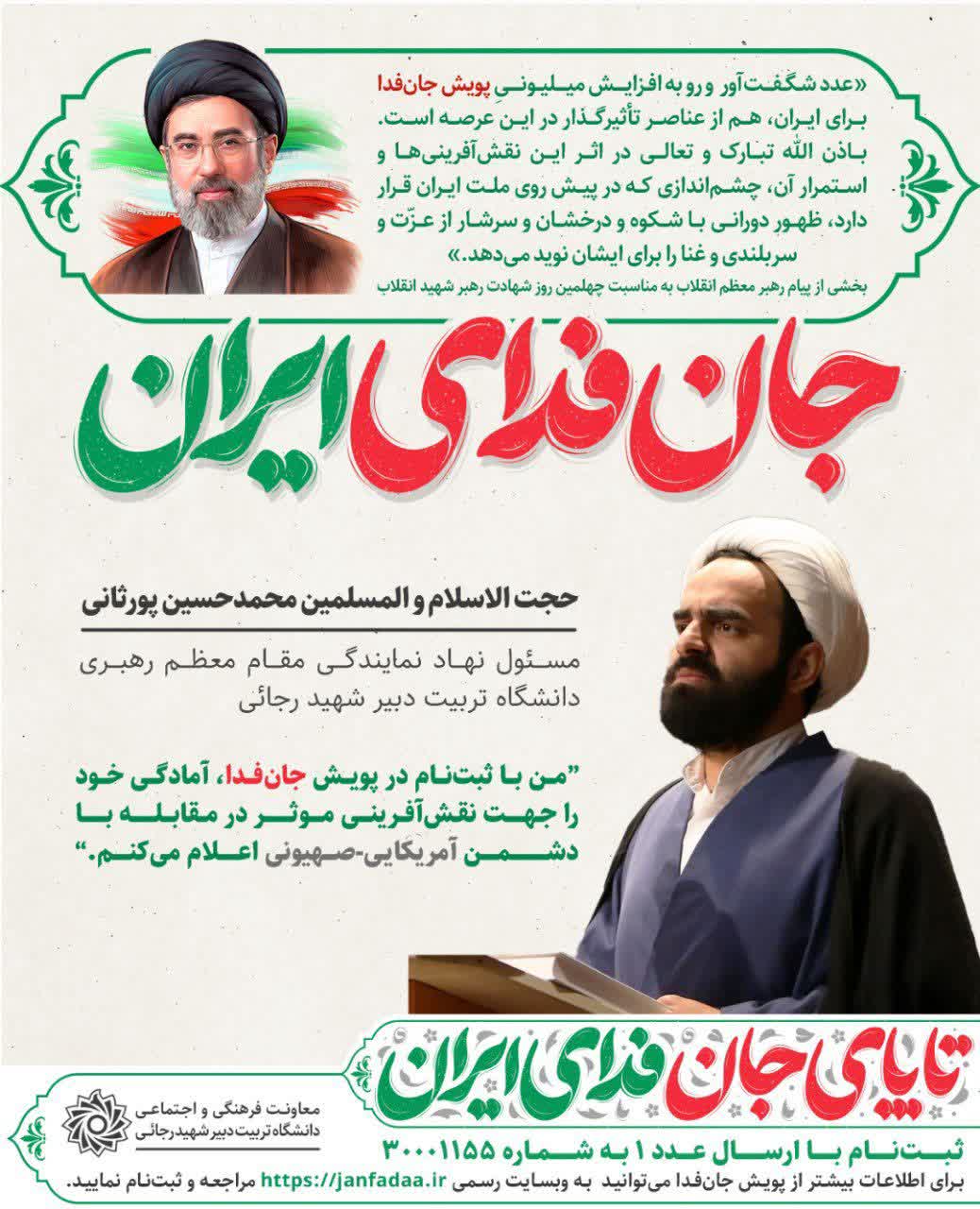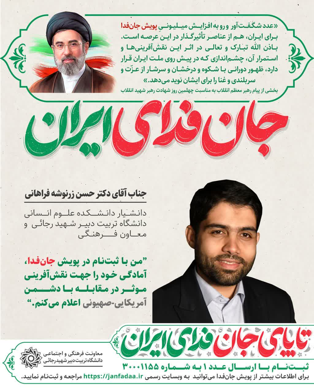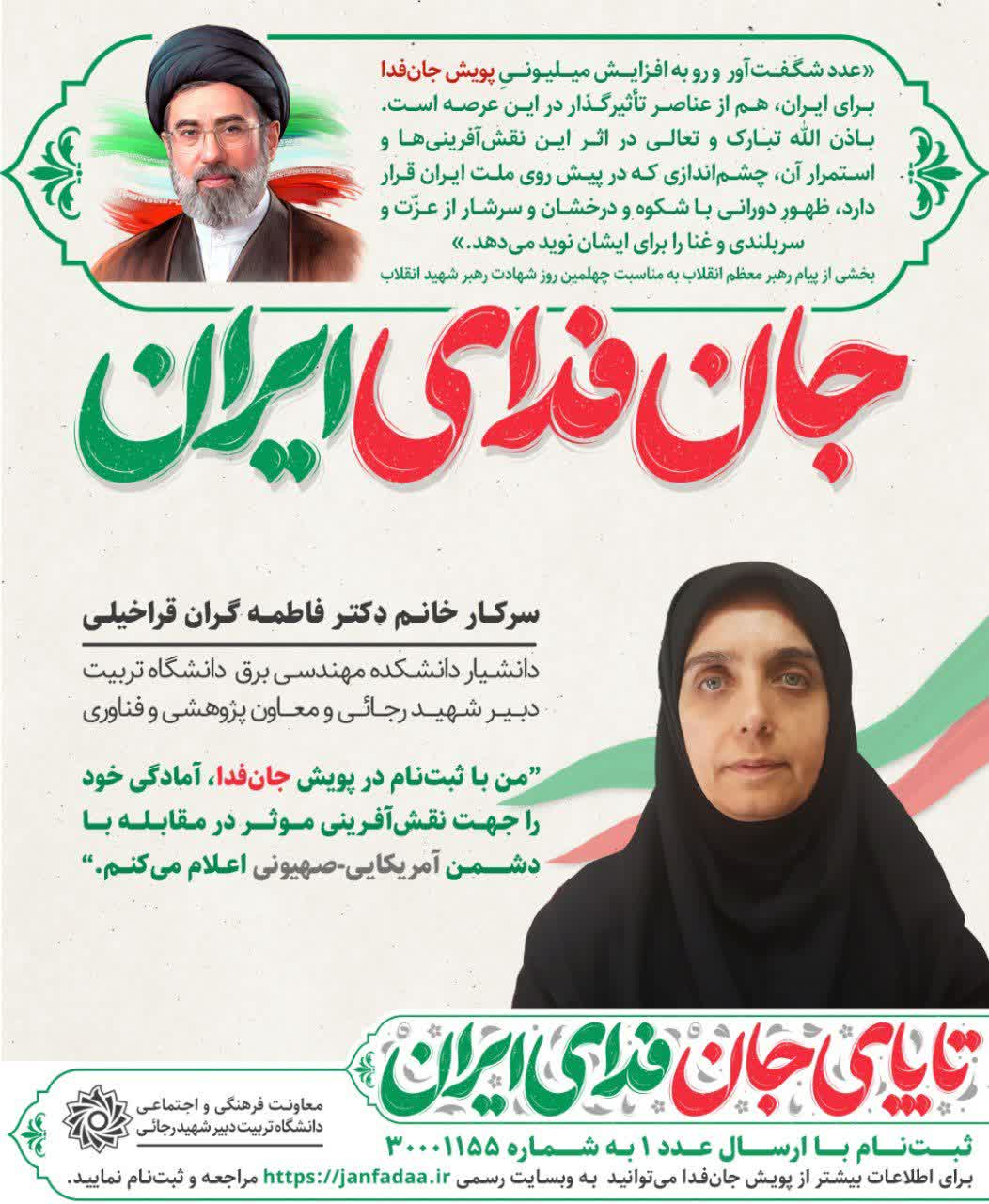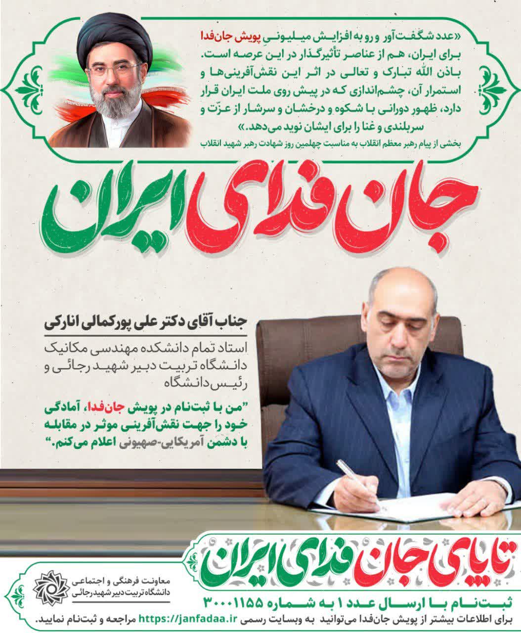 رئیس محترم دانشگاه تربیت دبیر شهید رجائی و معاونان ایشان در سامانه جان فدا ثبتنام کردند و آمادگی خود را جهت نقشآفرینی موثر در مقابله با دشمن آمریکایی-صهیونی اعلام کردند.