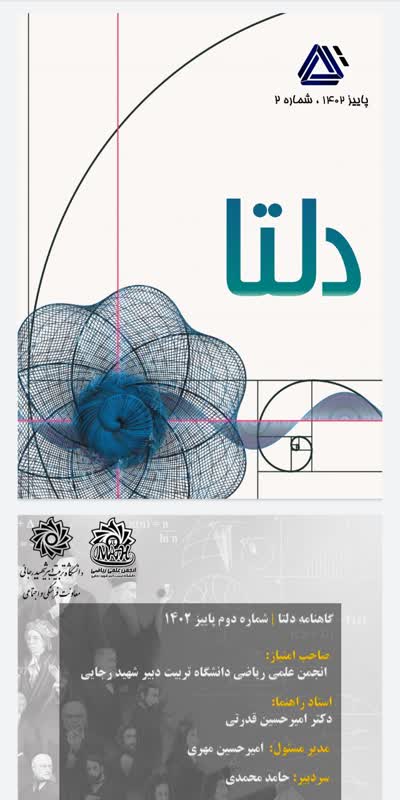 چاپ نشریه علمی تخصصی ریاضی گاهنامه دلتا ، شماره دوم ۳۰ آذر ۱۴۰۲/در اخبار معاونت فرهنگی و اجتماعی /توسط culture معاونت فرهنگی و اجتماعی خبر داد : به همت انجمن علمی دانشجویی ریاضی دانشگاه تربيت دبیر شهید رجایی انجام گردید: چاپ نشریه علمی تخصصی ریاضی گاهنامه دلتا ، شماره دوم صاحب امتیاز: انجمن علمی ریاضی استاد راهنما: دکتر امیرحسین قدرتی مدیر مسئول: امیرحسین مهری سردبیر: حامد محمدی زمان چاپ : ۱۴۰۲/۹/۲۵ در این شماره میخوانیم: سری فیبوناچی گذری بر تاریخچه بینهایت مثلثات و کاربردها معرفی کتاب: مقدمهای کوتاه بر ریاضیات کافه آموزش: نکات طلایی در طراحی تکلیف سریال فراکتالی: قسمت دوم، هندسه فراکتال فراتر از منطق کلاسیک(مقدمهای بر منطق فازی) ماراتن ریاضی (شماره۲) https://www.sru.ac.ir/wp-content/uploads/2023/12/17.jpg 800 400 culture https://www.sru.ac.ir/wp-content/uploads/2020/06/arm-uni-97-white-300x300.png culture2023-12-21 16:20:392023-12-21 16:20:40 چاپ نشریه علمی تخصصی ریاضی گاهنامه دلتا ، شماره دوم