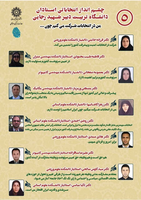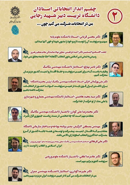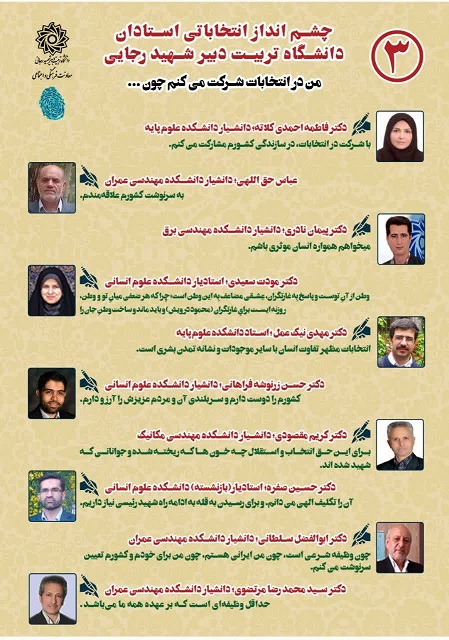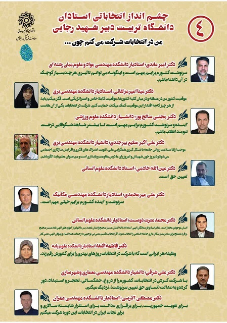 چشم انداز انتخاباتی اساتید دانشگاه شهید رجایی ۷ تیر ۱۴۰۳/در اخبار معاونت فرهنگی و اجتماعی /توسط cultureبه همت معاونت فرهنگی و اجتماعی: چشم انداز انتخاباتی اساتید دانشگاه تربیت دبیر شهید رجایی من در انتخابات شرکت می کنم چون:….. https://www.sru.ac.ir/wp-content/uploads/2024/06/photo12154589609-1.jpg 1280 907 culture https://www.sru.ac.ir/wp-content/uploads/2020/06/arm-uni-97-white-300x300.png culture2024-06-27 14:07:552024-06-29 13:05:12چشم انداز انتخاباتی اساتید دانشگاه شهید رجایی