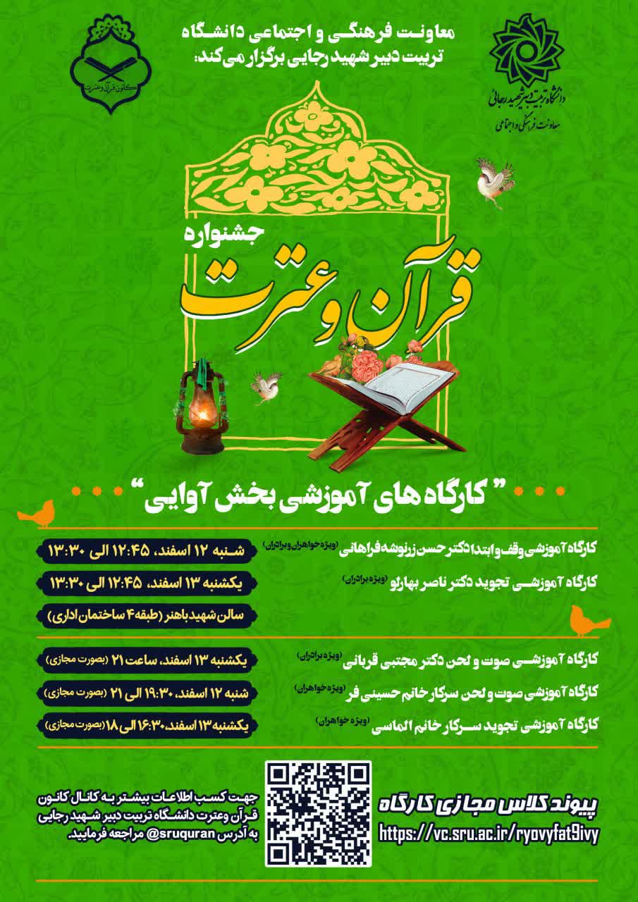 کارگاههای آموزشی بخش آوایی جشنواره قرآن و عترت دانشجویان ۱۲ اسفند ۱۴۰۲/در اخبار معاونت فرهنگی و اجتماعی /توسط culture معاونت فرهنگی و اجتماعی دانشگاه تربیت دبیر شهید رجایی برگزار می کند: کارگاههای آموزشی بخش آوایی جشنواره قرآن و عترت دانشجویان ️ کارگاه آموزشی وقف و ابتدا (ویژه برادران و خواهران) دکتر حسن زرنوشه فراهانی زمان: شنبه ۱۲ اسفند ساعت ۱۲:۴۵ الی ۱۳:۳۰ مکان: سالن شهید باهنر ️ کارگاه آموزشی تجوید ( ویژه برادران) دکتر ناصر بهارلو زمان: یکشنبه ۱۳ اسفند ساعت ۱۲:۴۵ الی ۱۳:۳۰ مکان: سالن شهید باهنر ️ کارگاه آموزشی صوت و لحن (ویژه برادران) دکتر مجتبی قربانی زمان: یکشنبه ۱۳ اسفند ساعت ۲۱ الی ۲۲ بصورت مجازی ️ کارگاه آموزشی صوت و لحن (ویژه خواهران) داور بین المللی سرکار خانم حسینیفر زمان: شنبه ۱۲ اسفند ساعت ۱۹:۳۰ الی ۲۱ بصورت مجازی ️ کارگاه آموزشی تجوید (ویژه خواهران) داور بین المللی سرکار خانم الماسی زمان: یکشنبه ۱۳ اسفند ساعت ۱۶:۳۰ الی ۱۸ بصورت مجازی ️ پیوند کلاس مجازی: https://vc.sru.ac.ir/ryovyfat9ivy https://www.sru.ac.ir/wp-content/uploads/2024/03/photo10079064490.jpg 1280 905 culture https://www.sru.ac.ir/wp-content/uploads/2020/06/arm-uni-97-white-300x300.png culture2024-03-02 15:53:082024-03-02 15:53:09کارگاههای آموزشی بخش آوایی جشنواره قرآن و عترت دانشجویان