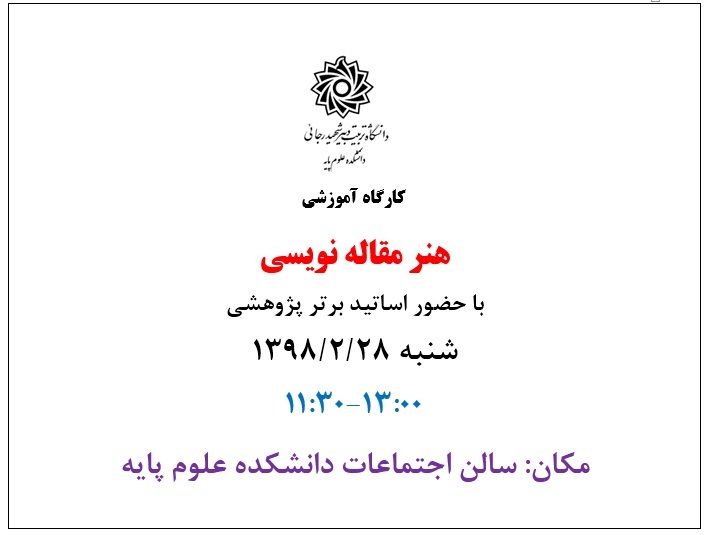 شورای آموزشی پژوهشی دانشکده علوم پایه با توجه به ضرورت آشنایی دانشجویان دوره های تحصیلات تکمیلی با مقاله نویسی، کارگاه آموزشی هنر مقاله نویسی را در روز شنبه بیست و هشتم اردیبهشت ماه جاری از ساعت ۱۱:۳۰ تا ساعت ۱۳ در محل سالن اجتماعات دانشکده علوم پایه برگزار می کند.