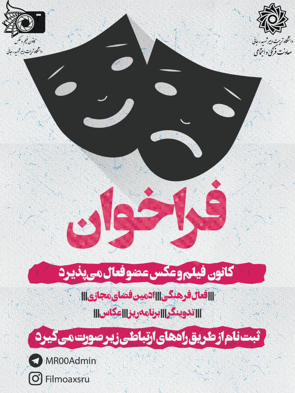 https://www.sru.ac.ir/wp-content/uploads/2021/12/فیلم-و-عکس.jpg606956culturehttps://www.sru.ac.ir/wp-content/uploads/2020/06/arm-uni-97-white-300x300.pngculture2021-12-06 18:00:162021-12-06 18:00:16کانون فیلم و عکس از افراد علاقمند به فعالیت عضو فعال میپذیرد.