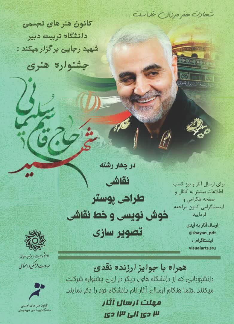 کانون هنرهای تجسمی دانشگاه تربیت دبیر شهید رجایی به مناسبت سالگرد شهادت سردار قاسم سلیمانی و برای پاسداشت این شهید والامقام و تمامی شهدای کشور عزیزمان در نظر دارد جشنواره ای مجازی در چهار بخش: *نقاشی* *خوشنویسی و خط نقاشی* *تصویرسازی* *و طراحی پوستر* در سطح تمامی دانشگاه های کشور برگزار کند.
