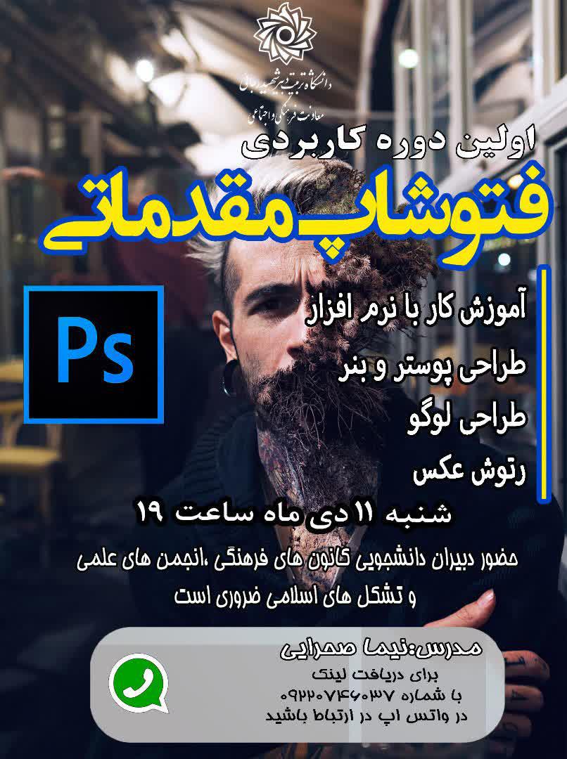 🔴 کلاس آموزش فتوشاپ بصورت کاربردی و فشرده ویژه دبیران محترم انجمن ها و کانون ها و تشکل های دانشجویی همراه با اعطای گواهی فرهنگی.