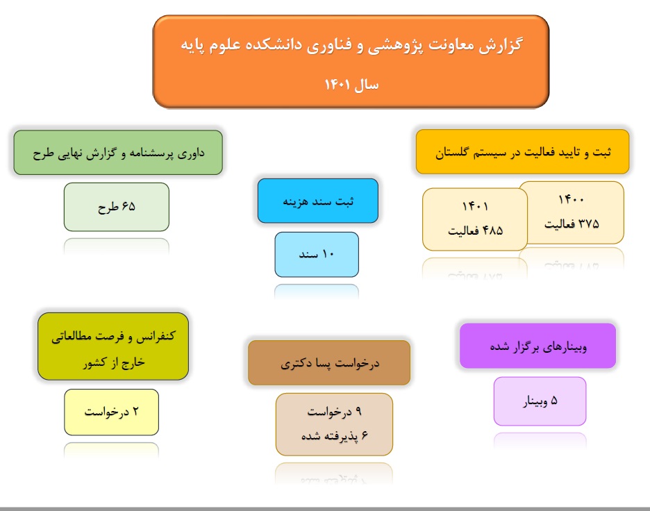در مراسم پایان سال دانشکده علوم پایه که در روز دوشنبه ۲۲ اسفند ۱۴۰۱ برگزار گردید، معاون پژوهشی و فناوری دانشکده ضمن تشکر از کارشناسان محترم و تبریک پیشاپیش سال نو، گزارش عملکرد این معاونت را در سال ۱۴۰۱ ارائه نمودند.