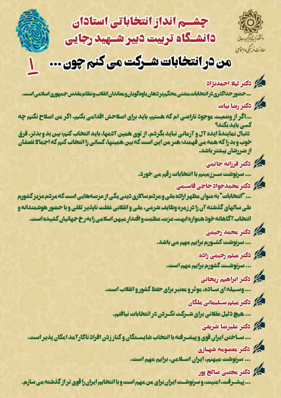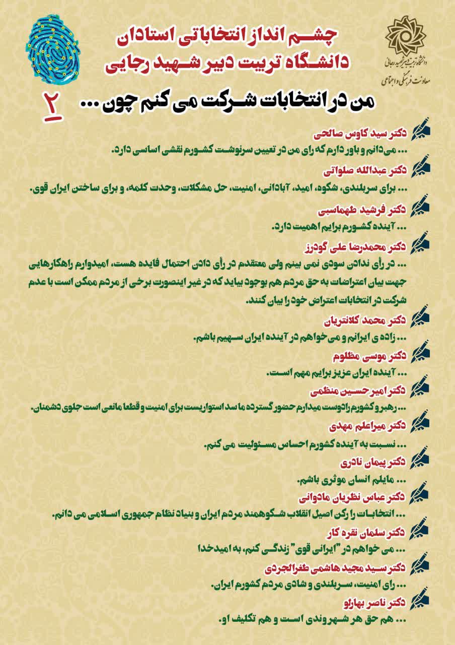 ️ چشم انداز انتخاباتی استادان دانشگاه تربیت دبیر شهید رجایی ۱۱ اسفند ۱۴۰۲/در اخبار معاونت فرهنگی و اجتماعی /توسط cultureبه همت معاونت فرهنگی و اجتماعی تربیت دبیر شهید رجایی: چشم انداز انتخاباتی استادان دانشگاه تربیت دبیر شهید رجایی ️ من در انتخابات شرکت میکنم چون … https://www.sru.ac.ir/wp-content/uploads/2024/03/photo10073404895.jpg 1080 1080 culture https://www.sru.ac.ir/wp-content/uploads/2020/06/arm-uni-97-white-300x300.png culture2024-03-01 12:12:572024-03-02 10:31:54️ چشم انداز انتخاباتی استادان دانشگاه تربیت دبیر شهید رجایی
