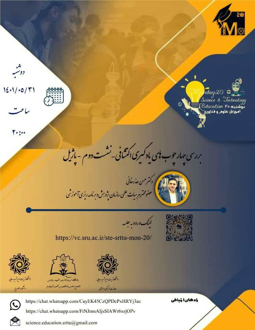 *برنامه دوشنبه ۲۰ – آموزش علوم وفناوری* در راستای ترویج علم هر دوشنبه ساعت ۲۰ به مدت ۲۰ دقیقه توسط دانشگاه تربیت دبیر شهید رجایی (معاونت فرهنگی و اجتماعی دانشگاه ، دانشکده علوم پایه و انجمن علمی دانشجویی آموزش علوم) به صورت الکترونیکی برگزار می شود.