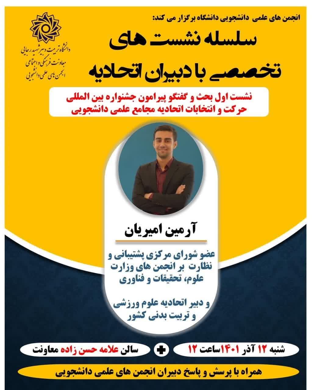 💢سلسه نشست های تخصصی با دبیران اتحادیه ۱۲ آذر ۱۴۰۱/در Uncategorised, اخبار معاونت فرهنگی و اجتماعی /توسط culture📣 معاونت فرهنگی و اجتماعی خبر داد؛ 🔴 انجمن های علمی-دانشجویی دانشگاه برگزار می کند: 💢سلسه نشست های تخصصی با دبیران اتحادیه ✅با حضور: آرمین امیریان زمان شنبه ۱۲ آذر ساعت ۱۲ مکان سالن علامه حسن زاده آملی https://www.sru.ac.ir/wp-content/uploads/2022/12/photo_۲۰۲۲-۱۲-۰۳_۰۸-۴۴-۵۹.jpg 1280 1027 culture https://www.sru.ac.ir/wp-content/uploads/2020/06/arm-uni-97-white-300x300.png culture2022-12-03 21:09:022022-12-03 21:09:02💢سلسه نشست های تخصصی با دبیران اتحادیه