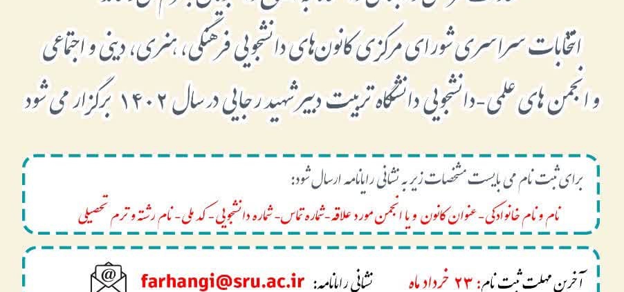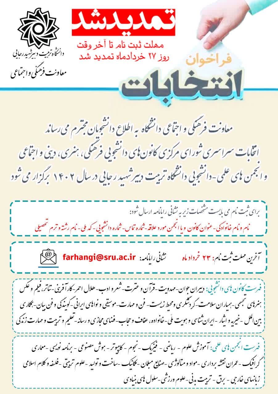 https://www.sru.ac.ir/wp-content/uploads/2023/06/photo_۲۰۲۳-۰۶-۱۶_۰۱-۰۸-۳۴-1.jpg1280902culturehttps://www.sru.ac.ir/wp-content/uploads/2020/06/arm-uni-97-white-300x300.pngculture2023-06-25 09:00:392023-06-25 11:56:57🔻مهلت ثبت نام در انتخابات کانونهای دانشجویی و انجمنهای علمی دانشگاه تربیت دبیر شهید رجایی تا آخر وقت روز ۷ تیرماه۱۴۰۲ تمدید شد.