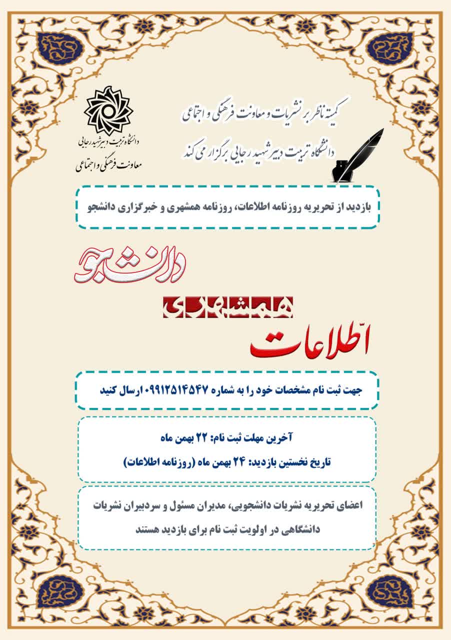 کمیته ناظر بر نشریات و معاونت فرهنگی و اجتماعی دانشگاه تربیت دبیر شهید رجایی برگزار میکند: