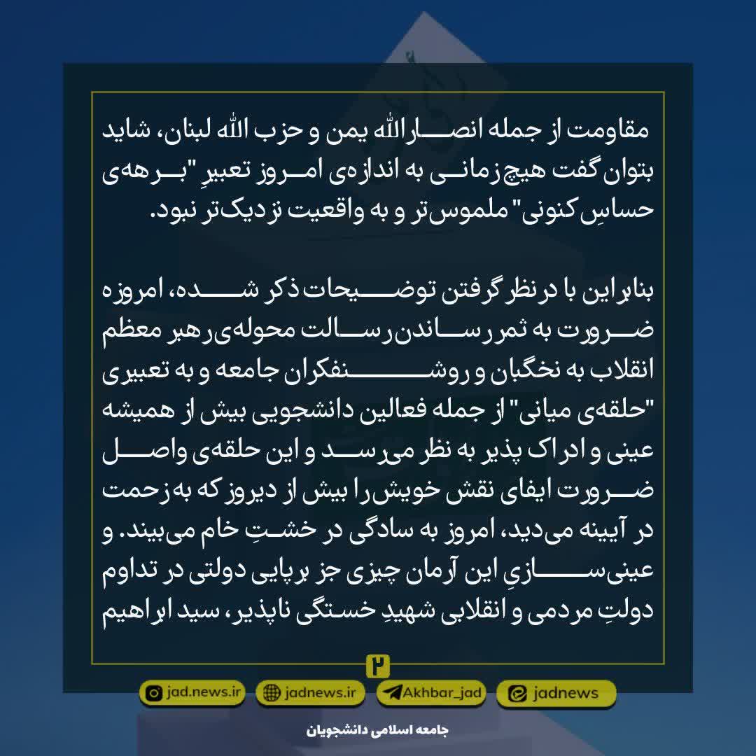 امروزه ضرورت به ثمر رساندن رسالت محولهی رهبر معظم انقلاب به نخگبان و روشنفکران جامعه و به تعبیری “حلقهی میانی” از جمله فعالین دانشجویی بیش از همیشه عینی و ادراک پذیر به نظر میرسد و این حلقهی واصل ضرورت ایفای نقش خویش را بیش از دیروز که به زحمت در آیینه میدید، امروز به سادگی در خشتِ خام میبیند.