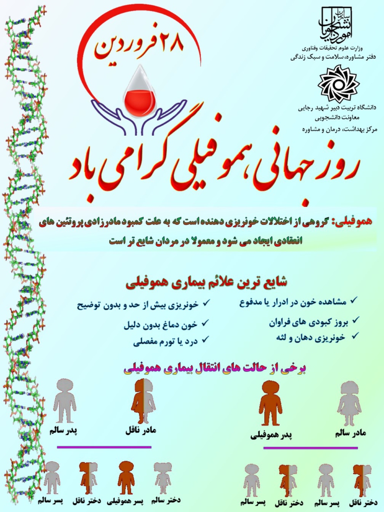 ۲۸ فروردین، روز جهانی هموفیلی ۲۸ فروردین ۱۴۰۲/در اخبار مشاوره، سلامت و سبک زندگی /توسط مدیر سایت https://www.sru.ac.ir/wp-content/uploads/2023/04/هموفيلي.jpg 1344 1008 مدیر سایت https://www.sru.ac.ir/wp-content/uploads/2020/06/arm-uni-97-white-300x300.png مدیر سایت2023-04-17 14:04:162023-04-17 14:04:16۲۸ فروردین، روز جهانی هموفیلی