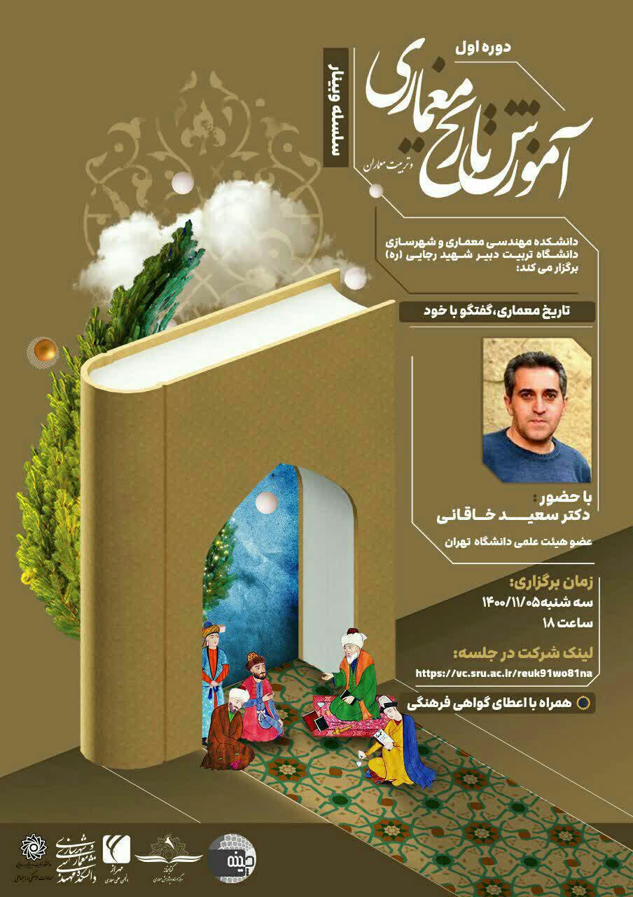 معاونت فرهنگی و اجتماعی، خبر داد؛ به همت انجمن علمی معماری و توسط دانشکده مهندسی معماری و شهرسازی دانشگاه تربیت دبیر شهید رجایی، برگزار گردید: برنامه دوم سلسله وبینار آموزش تاریخ معماری و تربیت معماران سخنران: دکتر سعید خاقانی ، عضو هیات علمی دانشگاه تهران تاریخ اجرا: ۱۴۰۰/۱۱/۵