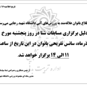 مدیر سایت2025-10-30 18:19:392025-10-30 18:26:23اطلاعیه مسابقه دو همگانیشنبه تا چهارشنبه: 8 تا 20